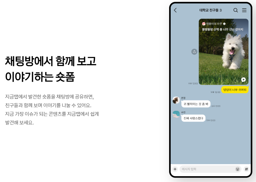 세 번째 탭은 '지금 탭'이라는 이름으로 새롭게 태어났습니다. 요즘 가장 핫한 주제의 오픈채팅이나 숏폼 영상들을 보며 시간을 보낼 수 있는 공간이라고 해요.