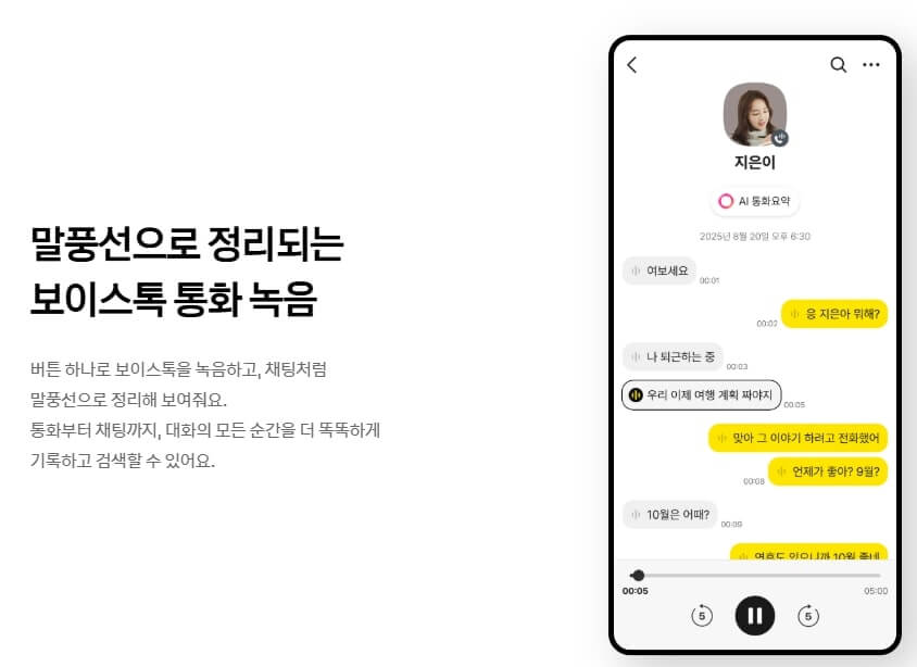 그리고! 많은 분들이 기다렸던 '보이스톡 통화 녹음' 기능이 드디어 추가되었습니다. 중요한 통화 내용을 다시 확인하거나, AI가 통화 내용을 요약해 주는 기능까지 제공된다고 하니 업무용으로도 정말 유용하게 쓰일 것 같습니다.